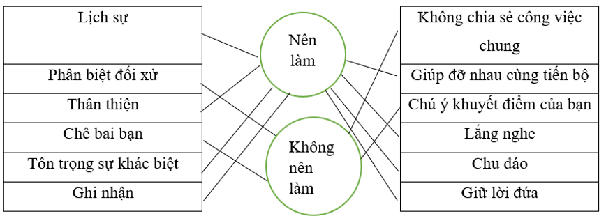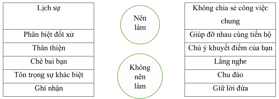 a) Nối mỗi thẻ chữ dưới đây vào ô “Nên làm’’ hoặc “Không nên làm’’ để thể hiện sự tôn trọng với bạn cùng giới và khác giới.