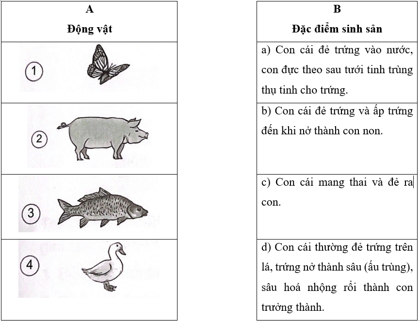 Câu 5 trang 45 VBT Khoa học lớp 5: Nối hình động vật ở cột A với mô tả về đặc điểm sinh sản của chúng ở cột B cho phù hợp.