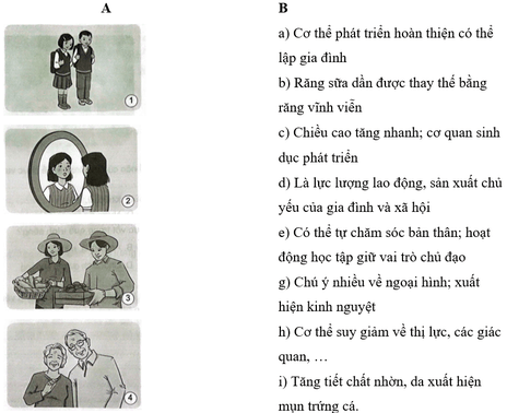 Câu 3 trang 77 VBT Khoa học lớp 5: Nối những nội dung mô tả đặc điểm của con người ở các giai đoạn khác nhau ở cột B với hình A cho phù hợp (một hình có thể nối với nhiều đặc điểm).