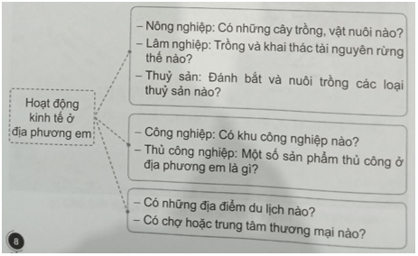 Câu 3 trang 8 Vở bài tập Lịch Sử và Địa Lí lớp 4: Tìm hiểu và trình bày một số hoạt động kinh tế ở địa phương em theo gợi ý dưới đây: