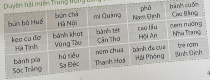 Câu 2 trang 49 Vở bài tập Lịch Sử và Địa Lí lớp 4: Em hãy khoanh tròn vào tên các món ăn tiêu biểu của vùng Duyên hải miền Trung trong bảng dưới đây: