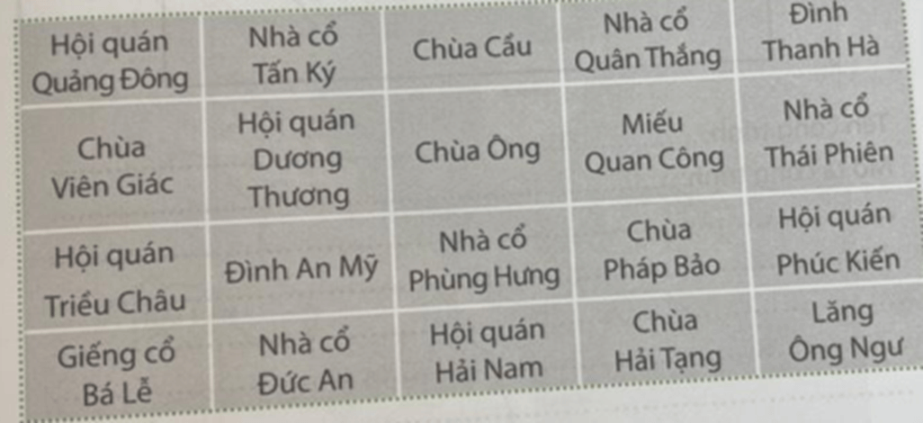 Câu 2 trang 55 Vở bài tập Lịch Sử và Địa Lí lớp 4: Em hãy phân loại một số công trình tiêu biểu ở phố cổ Hội An cho sẵn trong các ô dưới đây theo các nhóm: Hội quán người Hoa, Nhà cổ, Chùa chiền.