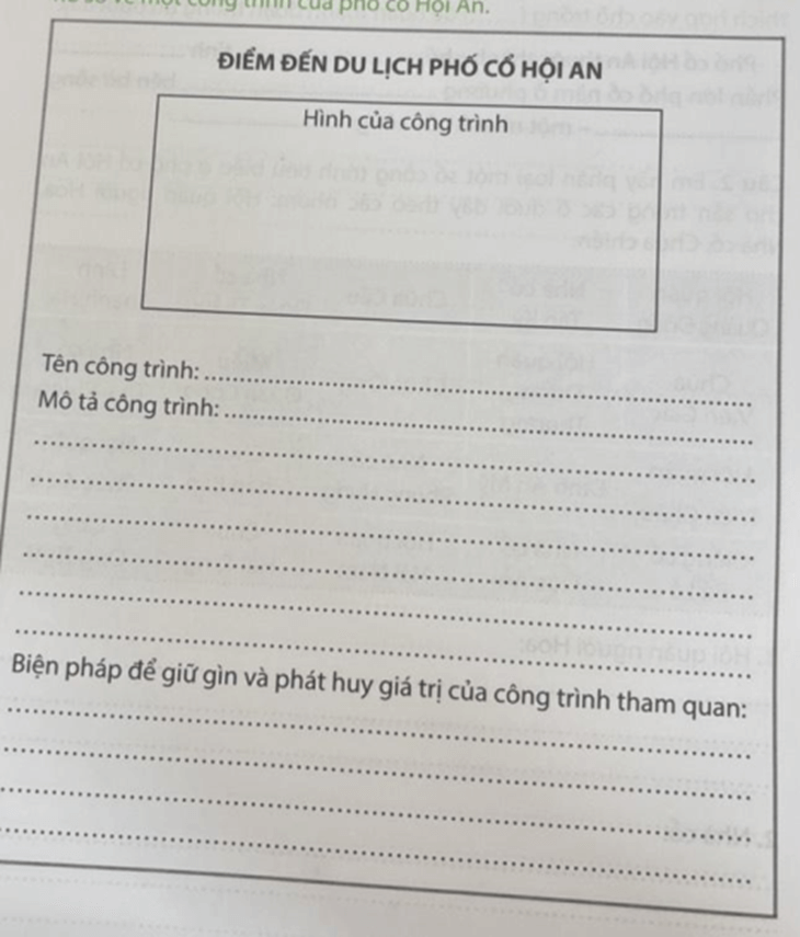 Câu 3 trang 56 Vở bài tập Lịch Sử và Địa Lí lớp 4: Giả sử em đã đến tham quan phố cổ Hội An, hãy chọn và xây dựng hồ sơ về một công trình của phố cổ Hội An.