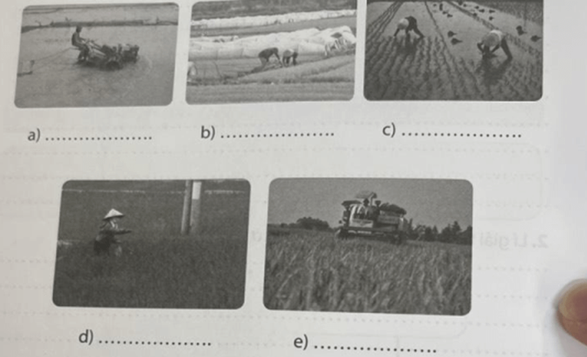 Câu 6 trang 28 Vở bài tập Lịch Sử và Địa Lí lớp 4: Em hãy điền tên các công đoạn sản xuất lúa ở vùng Đồng bằng Bắc Bộ vào chỗ trống (......) dưới các hình.