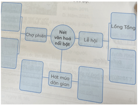 Bài tập 6 trang 23 Vở bài tập Lịch Sử và Địa Lí lớp 4: Hoàn thành sơ đồ tư duy thể hiện một số nét văn hoá nổi bật ở vùng Trung du và miền núi Bắc Bộ.