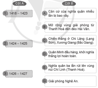 Câu 8 trang 30 VBT Lịch Sử và Địa Lí lớp 5: Ghép các mốc thời gian ở cột A với nội dung sự kiện ở cột B cho phù hợp với diễn biến chính của cuộc khởi nghĩa Lam Sơn.