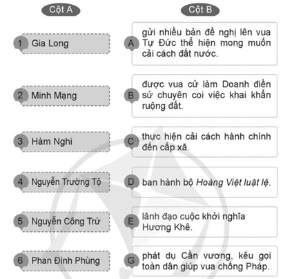 Câu 6 trang 32 VBT Lịch Sử và Địa Lí lớp 5: Ghép tên nhân vật ở cột A với nội dung phù hợp ở cột B để thấy được vai trò của các nhân vật lịch sử dưới thời Nguyễn.