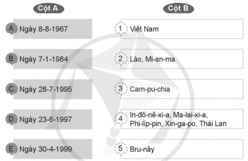Câu 3 trang 52 VBT Lịch Sử và Địa Lí lớp 5: Ghép ý ở cột A (thời gian) với ý ở cột B (quốc gia gia nhập ASEAN) sao cho phù hợp.