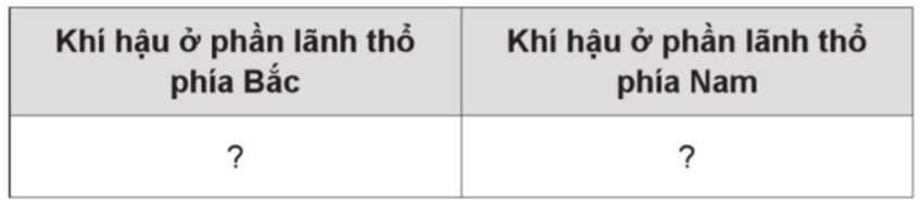 Câu 6 trang 7 VBT Lịch Sử và Địa Lí lớp 5: Lựa chọn các ý và sắp xếp vào bảng theo mẫu dưới đây để phân biệt đặc điểm khí hậu ở phần lãnh thổ phía bắc và phần lãnh thổ phía nam dãy Bạch Mã.