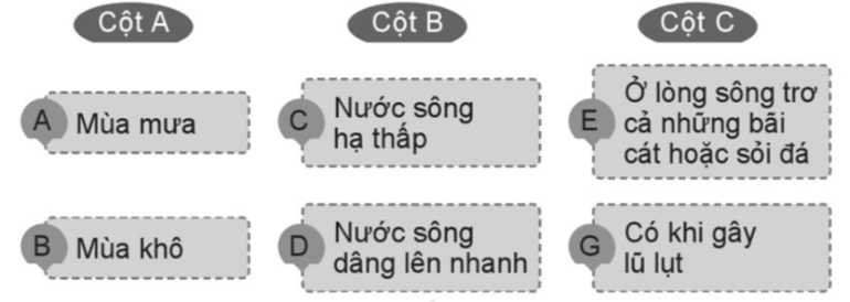 Câu 7 trang 8 VBT Lịch Sử và Địa Lí lớp 5: Nối các ô ở các cột A, B, C với nhau để thể hiện mối quan hệ giữa khí hậu và sông ngòi của nước ta.