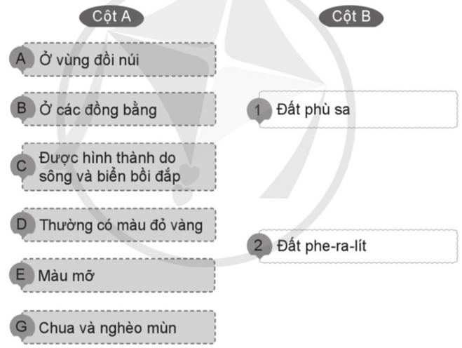 Câu 8 trang 8 VBT Lịch Sử và Địa Lí lớp 5: Ghép các ý chỉ đặc điểm và phân bố ở cột A với tên loại đất ở cột B sao cho phù hợp.