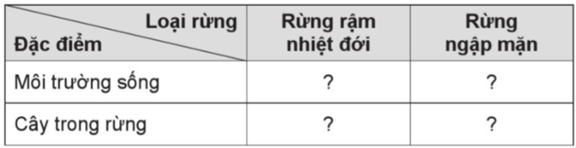 Câu 9 trang 8 VBT Lịch Sử và Địa Lí lớp 5: Lựa chọn các ý và sắp xếp vào bảng theo mẫu dưới đây để phân biệt đặc điểm của rừng rậm nhiệt đới và rừng ngập mặn.