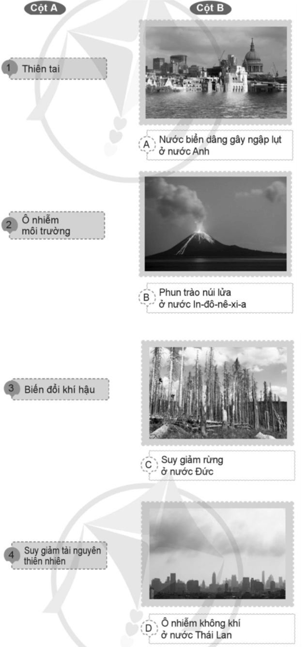 Câu 4 trang 62 VBT Lịch Sử và Địa Lí lớp 5: Ghép vấn đề môi trường ở cột A với hình ảnh ở cột B sao cho phù hợp.