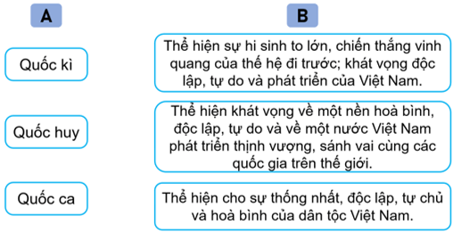 Bài tập 6 trang 7 Vở bài tập Lịch Sử và Địa Lí lớp 5: Nối thông tin ở cột A với cột B sao cho phù hợp về ý nghĩa của Quốc kì, Quốc huy và Quốc ca nước Cộng hoà xã hội chủ nghĩa Việt Nam.