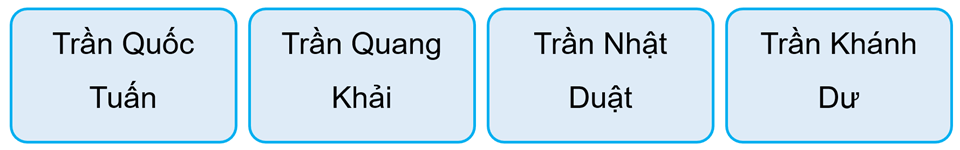 Bài tập 5 trang 40 Vở bài tập Lịch Sử và Địa Lí lớp 5: Viết tên 4 nhân vật của thời Trần mà em cho là tiêu biểu vào các ô dưới đây.