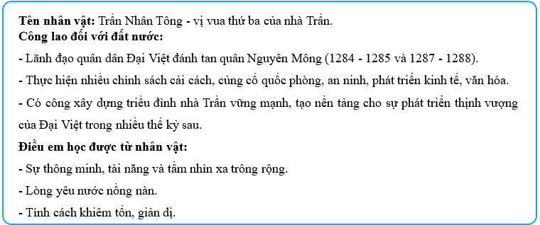 Bài tập 10 trang 43 Vở bài tập Lịch Sử và Địa Lí lớp 5: Hoàn thành thẻ nhớ về một nhân vật lịch sử có đóng góp đối với đất nước ở thời nhà Trần mà em yêu thích.