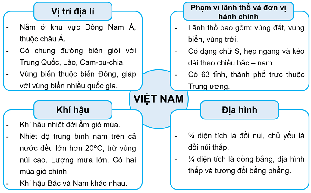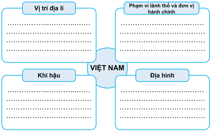 Bài tập 1 trang 44 Vở bài tập Lịch Sử và Địa Lí lớp 5: Hoàn thành sơ đồ dưới đây về đặc điểm vị trí địa lí, phạm vi lãnh thổ, đơn vị hành chính, địa hình và khí hậu của Việt Nam.