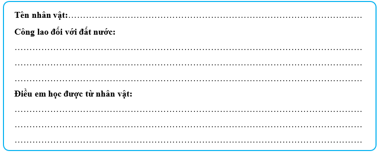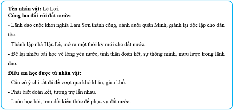 Bài tập 6 trang 50 Vở bài tập Lịch Sử và Địa Lí lớp 5: Hoàn thành thẻ nhớ về một nhân vật lịch sử tiêu biểu trong khởi nghĩa Lam Sơn hoặc Triều Hậu Lê mà em yêu thích.