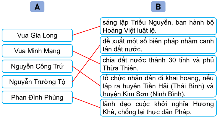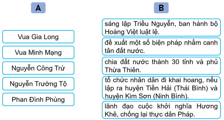 Bài tập 4 trang 53 Vở bài tập Lịch Sử và Địa Lí lớp 5: Nối thông tin ở cột A với thông tin ở cột B cho phù hợp về đóng góp của một số nhân vật lịch sử dưới Triều Nguyễn.