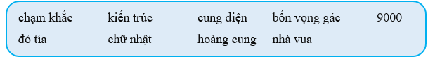 Cố cung có hơn (5)… căn phòng, gồm cung điện, từ đền đài, lầu gác. Tất cả đều được làm từ chất liệu quý hiếm, (6)… tỉ mỉ hình rồng, phượng và sơn son thếp vàng từ mái đến vòm,... Cố cung được chia làm hai phần, phần chính là nơi (7)… điều hành việc nước, gồm ba cung điện lớn; hậu cung là nơi ở của vua và hoàng tộc. Cố cung là quần thể (8)… lớn nhất và đẹp nhất Trung Quốc. Công trình này mang dấu ấn của một người Việt, đó là Nguyễn An.