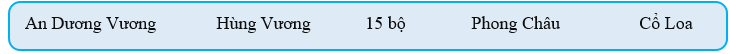 Nhà nước Văn Lang chia thành (1)…, đứng đầu là (2)… . Kinh đô đặt ở (3)… (Phú Thọ). Đứng đầu Nhà nước Âu Lạc là (4)… kinh đô đóng ở (5)… (Đông Anh, Hà Nội).