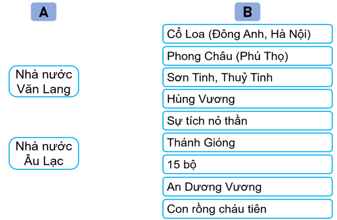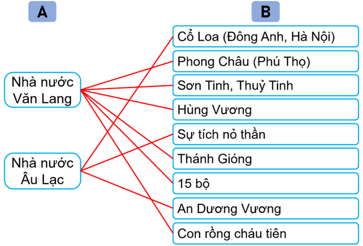 4.1. Nối thông tin ở cột A với thông tin ở cột B cho phù hợp về Nhà nước Văn Lang và Nhà nước Âu Lạc.