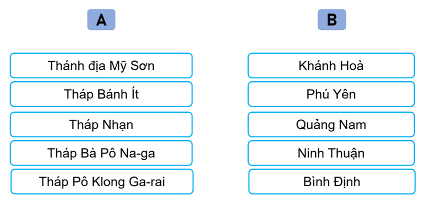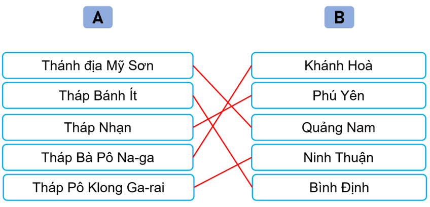 Bài tập 3 trang 30 Vở bài tập Lịch Sử và Địa Lí lớp 5: Nối thông tin ở cột A với thông tin ở cột B cho phù hợp về các đền tháp Chăm ở Việt Nam.