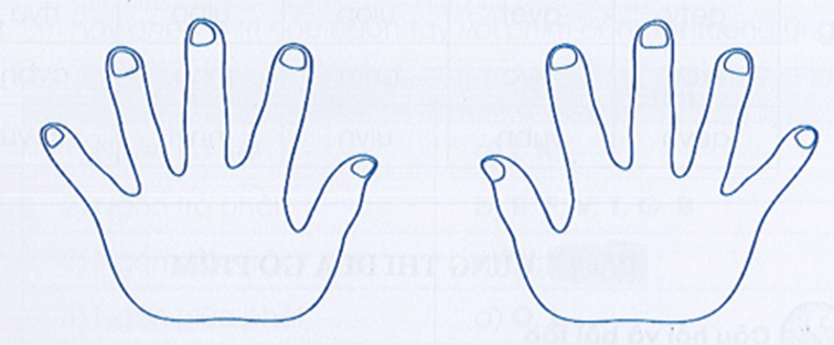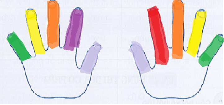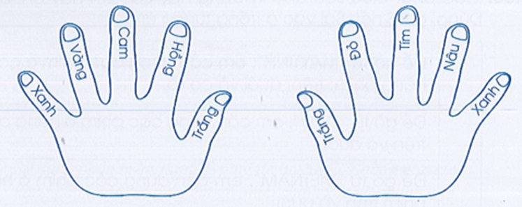 Vở bài tập Tin học lớp 3 trang 28 Câu A68: Dựa vào màu đã có sẵn ở các ngón tay trên hai bàn tay, em hãy ghi lại các màu tương ứng khi em cần gõ các từ sau: em yeu truong em