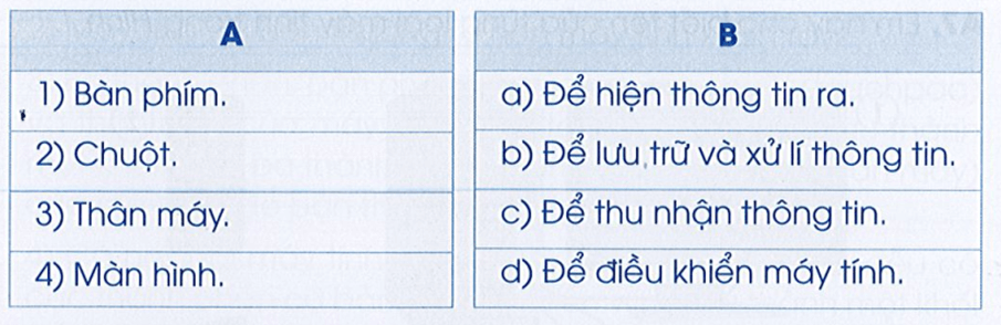 Vở bài tập Tin học lớp 3 trang 5 Câu A4: Em hãy ghép mỗi thành phần của máy tính cho cột A với đúng chức năng của chúng ở cột B.