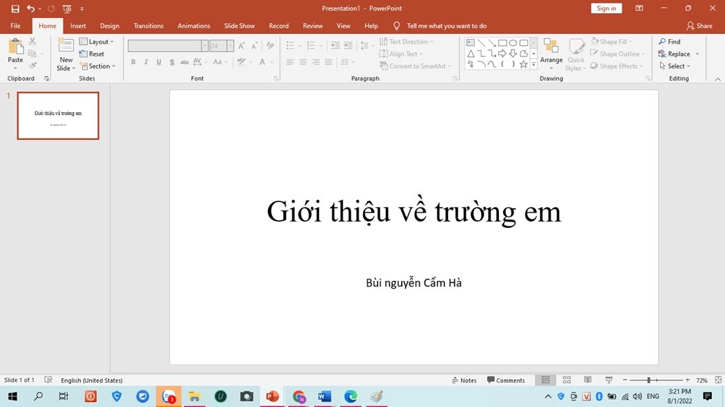 - Tạo trang trình chiếu 1: Tiêu đề: Gioi thieu ve truong em; Nội dung: Tên của em.