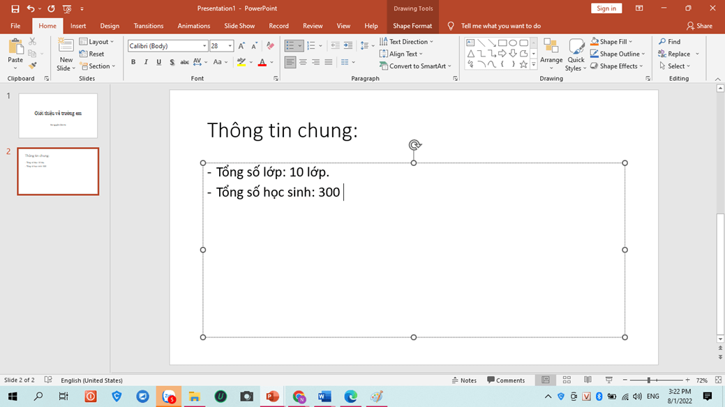 - Trang trình chiếu 2: Tiêu đề: Thong tin chung; Nội dung: Một số thông tin để giới thiệu về trường em.