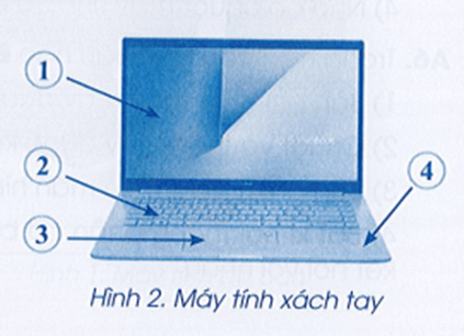 Vở bài tập Tin học lớp 3 trang 6 Câu A8: Các thành phần của máy tính xách tay trong Hình 2 được đánh số thứ tự. Em hãy chọn các từ sau để gọi tên các thành phần này: Vùng cảm ứng, màn hình, thân máy, bàn phím.