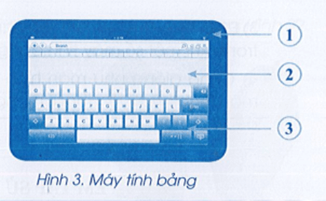 Vở bài tập Tin học lớp 3 trang 7 Câu A9: Các thành phần của máy tính bảng trong Hình 3 được đánh số thứ tự. Em hãy chọn các từ sau để gọi tên các thành phần này: bàn phím ảo, thân máy, màn hình.