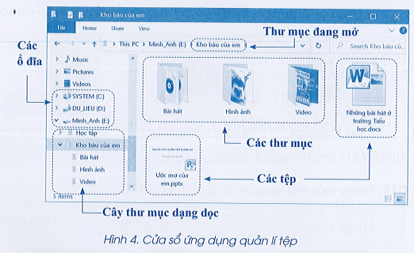 Trên thanh điều hướng của cửa sổ phần mềm quản lí tệp, hộp đường dẫn cho biết thư mục nào đang mở. Ở Hình 4, thư mục đang mở là thư mục “Kho báu của em”.