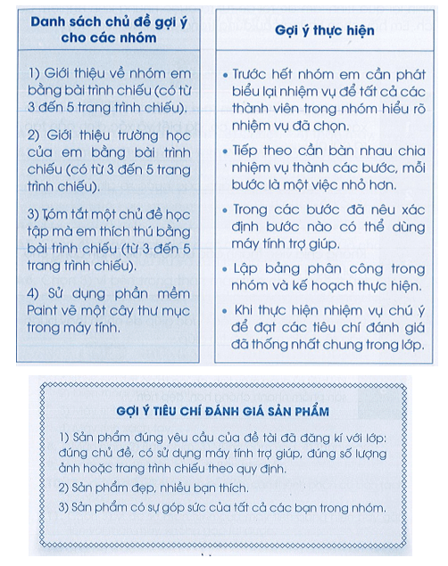 Câu F12 trang 66 SBT Tin học lớp 3: Mỗi nhóm chọn thực hiện một đề tài trong danh sách ở Bảng 1 hoặc tự đề xuất với thầy, cô giáo đề tài mà nhóm yêu thích. Hãy sử dụng sự trợ giúp của máy tính để thực hiện đề tài. Các nhóm sẽ trình bày trước lớp kết quả thực hiện đề tài của mình.