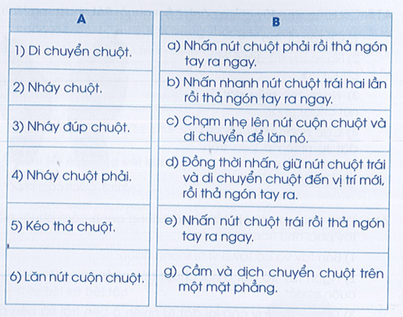 Vở bài tập Tin học lớp 3 trang 9 Câu A17: Em hãy ghép mỗi thao tác sử dụng chuột cho ở cột A với cách thực hiện tương ứng cho ở cột B.