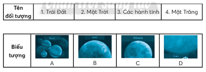 Vở bài tập Tin học lớp 3 trang 35 Bài tập 1: Nối tên đối tượng với biểu tượng tương ứng trên cửa sổ ban đầu của phần mềm SolarSystem.