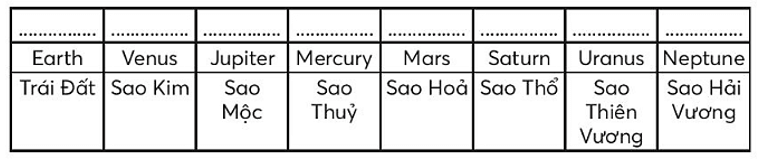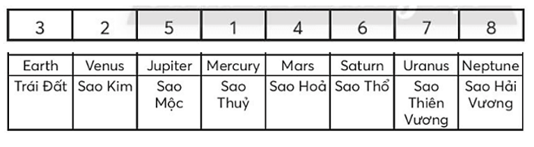 Các hành tinh trong hệ mặt trời trong bảng dưới đây sắp xếp sai thứ tự theo chiều từ gần đến xa mặt trời. Hãy điền thứ tự đúng của mỗi hành tinh vào chỗ chấm, bắt đầu từ số 1 là hành tinh gần mặt trời nhất.