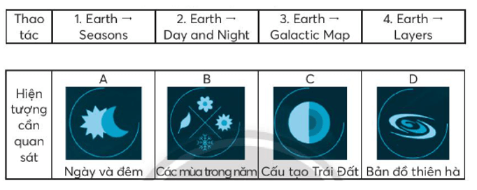 Nối mỗi thao tác với hiện tượng cần quan sát, tìm hiểu về trái đất như sau: