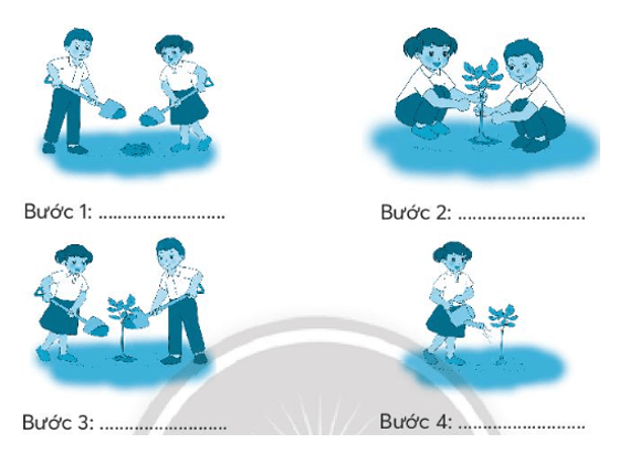 Vở bài tập Tin học lớp 3 trang 42 Bài tập 3: Hai bạn nhỏ được giao nhiệm vụ trồng cây nhưng các bạn chưa biết phải làm thế nào. Em hãy điền tên việc cần làm cho mỗi hình dưới đây để hướng dẫn các bạn trồng cây nhé (sử dụng các từ gợi ý: đào hố, đặt cây vào hố, lấp đất, tưới nước)