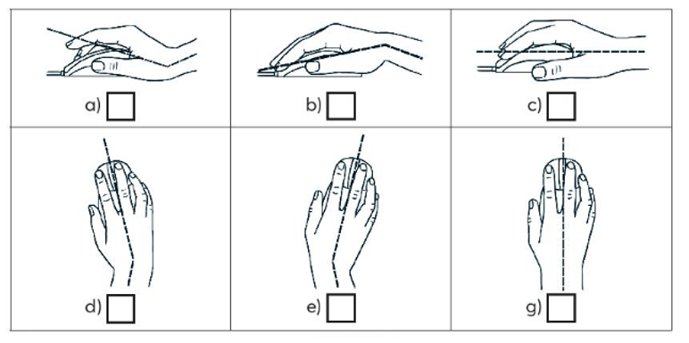 Vở bài tập Tin học lớp 3 trang 12 Bài tập 3: Đánh dấu X vào ô trống để chọn những hình là cách cầm chuột đúng.