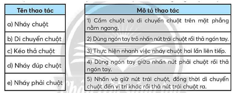 Vở bài tập Tin học lớp 3 trang 12 Bài tập 4: Ghép tên mỗi thao tác ở cột bên trái với một mô tả tương ứng ở cột bên phải?