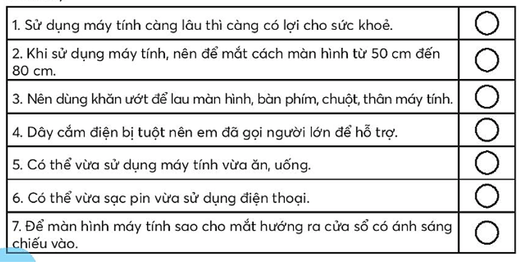 Vở bài tập Tin học lớp 3 trang 12 Bài tập 5: Em hãy tô màu vào hình tròn bên cạnh những phát biểu đúng trong bảng dưới đây.