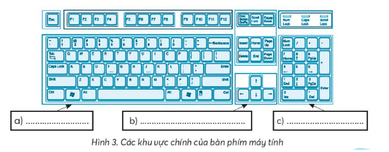 Vở bài tập Tin học lớp 3 trang 13 Bài tập 1: Em hãy điền vào chỗ chấm tên khu vực bàn phím ở Hình 3.