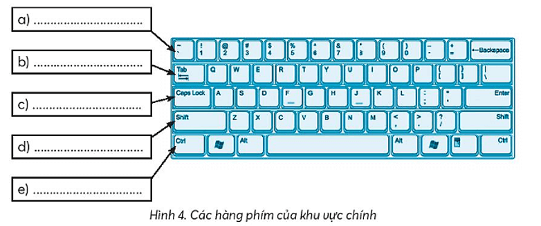 Vở bài tập Tin học lớp 3 trang 14 Bài tập 2: Em hãy điền vào chỗ chấm tên hàng phím của khu vực chính của bàn phím ở Hình 4.