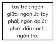 Vở bài tập Tin học lớp 3 trang 14 Bài tập 4: Em hãy điền vào chỗ chấm các cụm từ còn thiếu để hướng dẫn cách đặt ngay ngón tay lên đúng phím (sử dụng các cụm từ gợi ý trong khung, một cụm từ có thể được dùng nhiều lần).