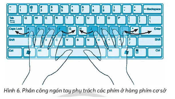 Ngón trỏ tay trái đặt lên phím F, ngón giữa tay trái đặt lên phím D, ngón áp út tay trái đặt lên phím S, ngón út tay trái đặt lên phim A, ngón trỏ tay phải đặt lên phím J, ngón giữa tay phải đặt lên phím K, ngón áp út tay phải đặt lên phím L, ngón út tay phải đặt nên phím chấm phẩy, hai ngón tay cái đặt lên phím dấu cách.