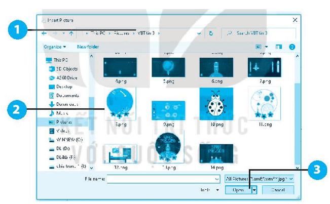 Vở bài tập Tin học lớp 3 trang 44 Câu 5: Em hãy quan sát cửa sổ Insert Picture và điền số tương ứng vào ô trống đúng với thứ tự để thêm hình ảnh vào trang chiếu.