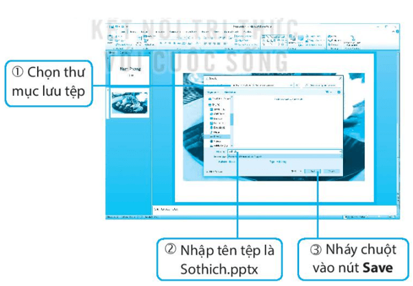 Bước 6: Trong bảng chọn File, chọn lệnh Save và thực hiện như hình sau để lưu tệp với tên Sothich.pptx.