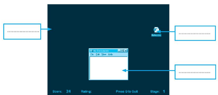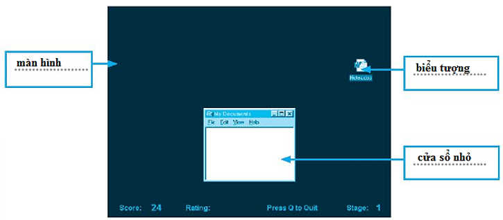 Vở bài tập Tin học lớp 3 trang 52, 53 Câu 5: Hãy điền các cụm từ: màn hình, biểu tượng, cửa sổ nhỏ thích hợp vào chỗ chấm trong hình sau: